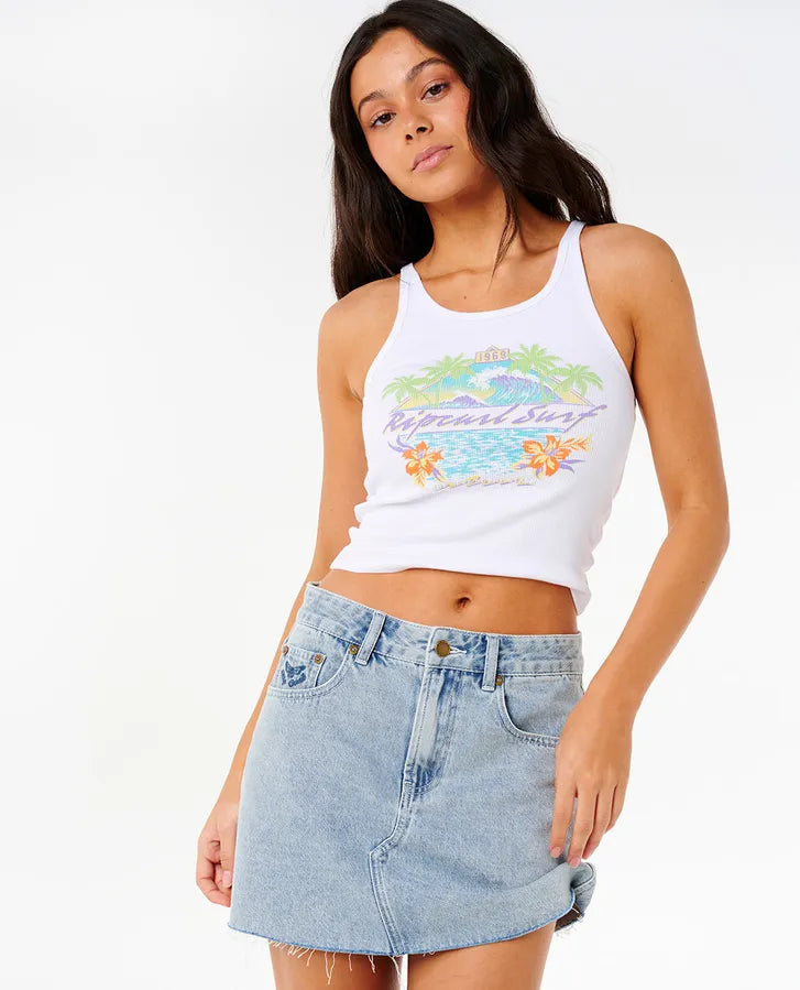 A sleek essential with a touch of edge, the Es Vedra Rib Tank is designed for warm days and endless adventures. Made from stretch cotton rib for a fitted, flattering feel, this racerback tank moves with you while keeping things comfortable. The front print adds a pop of personality, making it the perfect go-to for layering or pairing with your favorite denim for an effortlessly cool vibe.