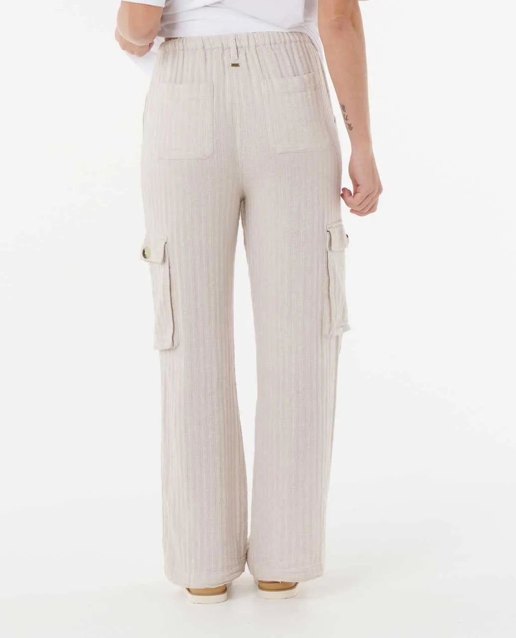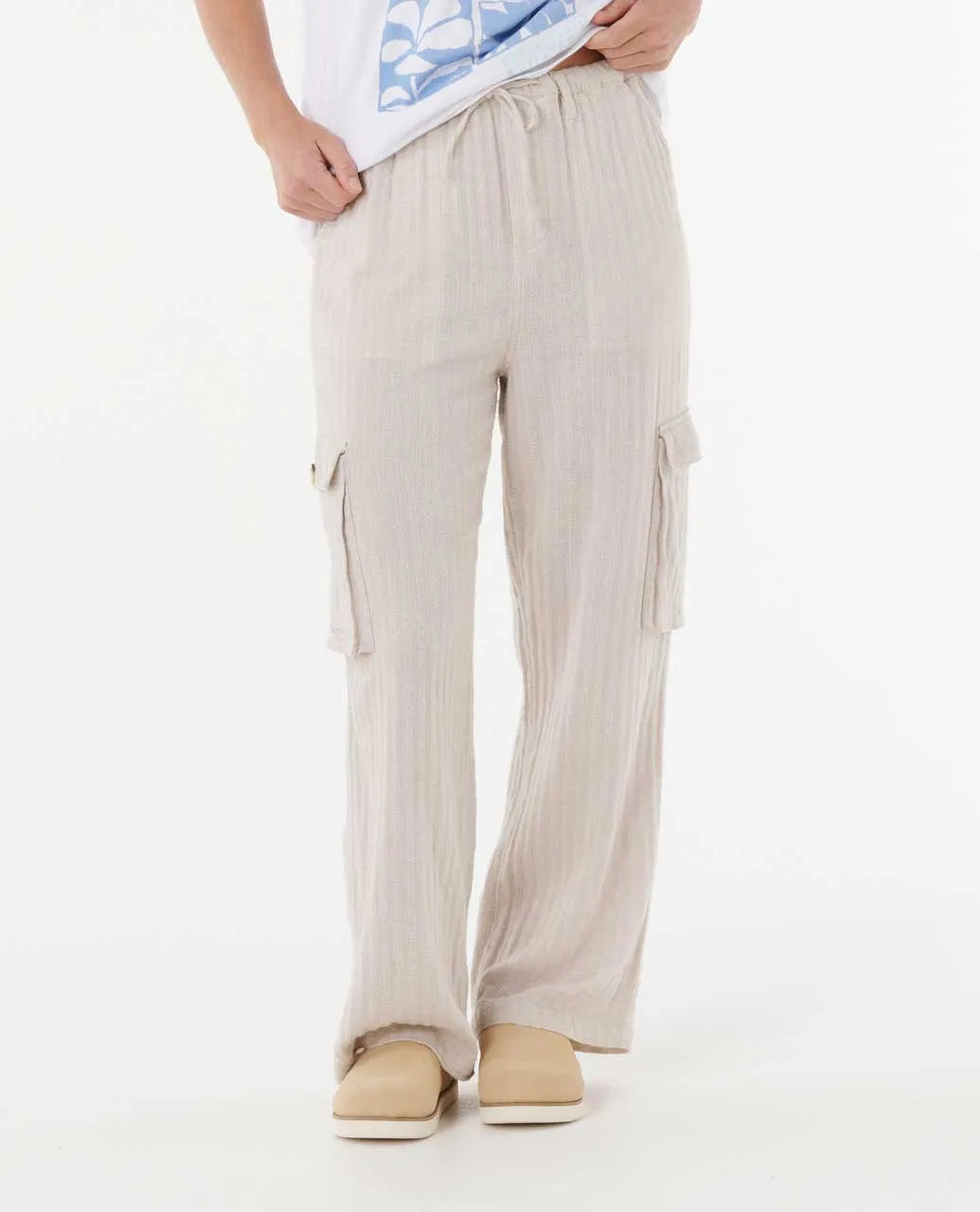 Relaxed and breathable, the Oceanic Textured Pant is crafted from a soft cotton-linen blend with a softener wash. It features an adjustable drawcord waist, side pockets, a metal logo trim, and an easy-wearing silhouette for everyday comfort.